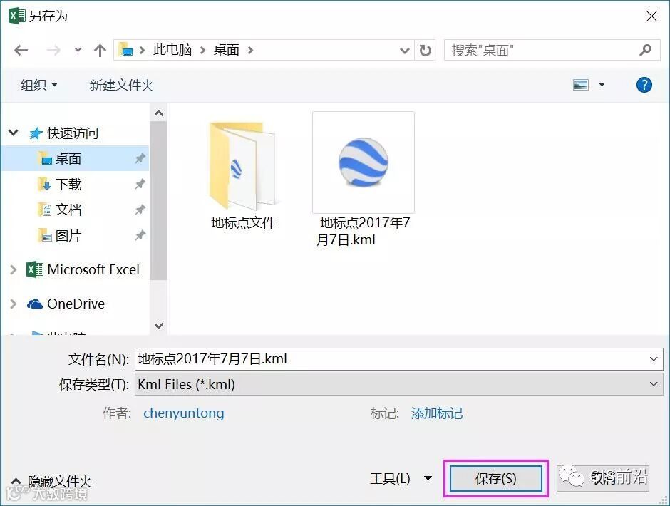 下一步:点击“生成”按钮后会提示保存路径,文件名格式为(地标点—年月日)也可以根据自己的要求修改名字,选择好路径后点击保存即可生成KML文件,相关图示如下: