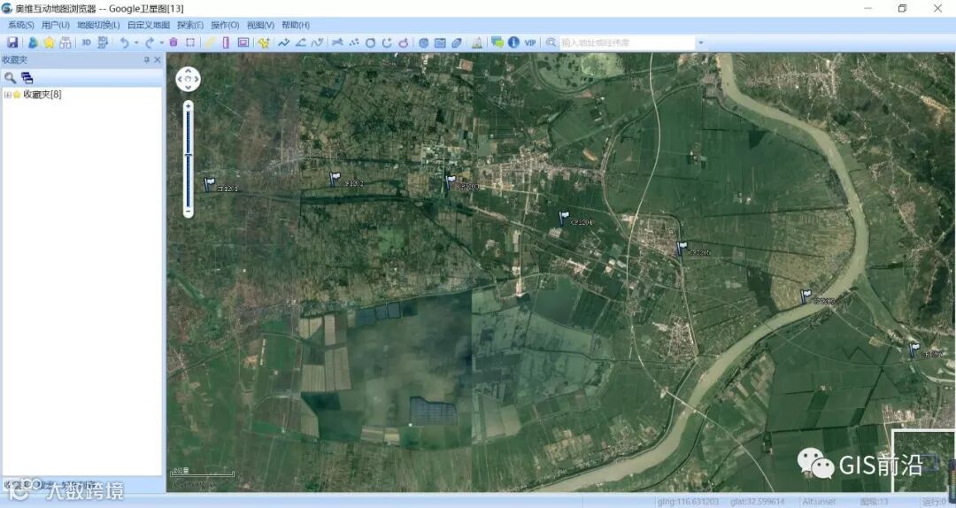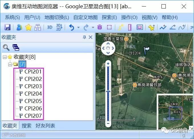 将KML文件导入到奥维互动地图中,点击顶部“系统”>>>导入对象>>>选择地标点文件>>>打开>>>导入>>>导入成功确定,导入成功的收藏夹示意图如下:
