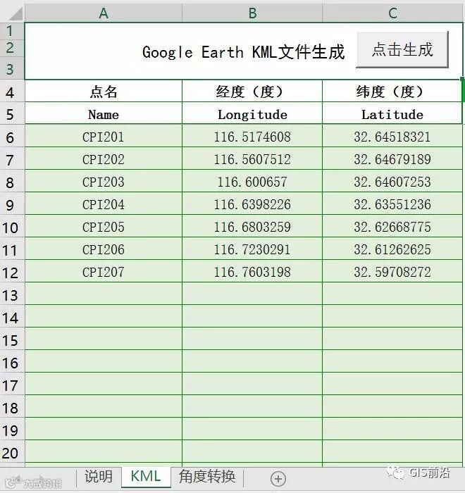 注意:KML表格中的点名(Name)不能为中文字符,因为生成的KML文件存储格式默认编码为ANSI格式不属于UTF-8编码格式,若需要输入中文字符需要将生成完毕的KML文件转为UTF-8编码格式,不然文件会出现乱码Google Earth不能正常读取。