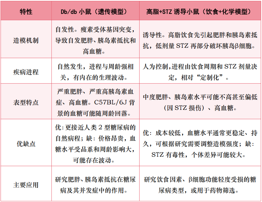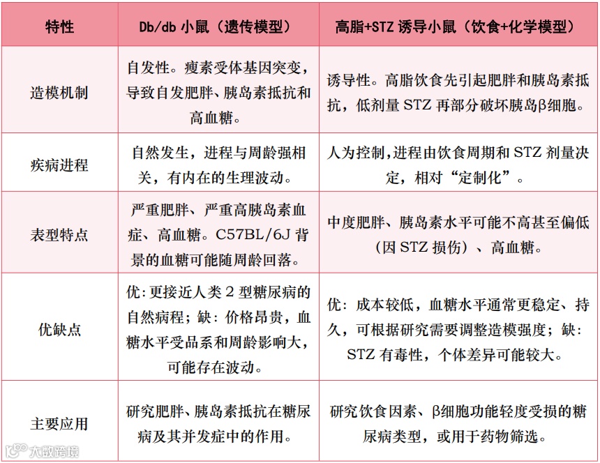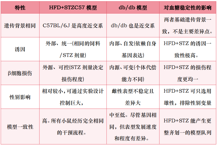 其根本原因在于两种模型的造模机制有本质区别:HFD+STZ是可控的、外源性诱导的模型,而db/db是自发的、遗传决定的模型。接下来,我们对上述差异点进行详细解读: