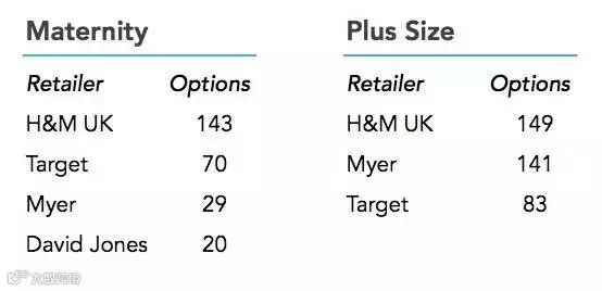 另外:H&M在尺码的选择上有更多选择,甚至还有很多是为了准妈妈而量身定制的。下图是英国的H&M的附加尺码的统计和当地主要竞争品牌的对比: