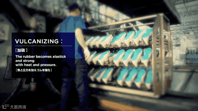 其过程就是用橡胶为鞋底粘贴,模压和上胶后,将鞋面和大底在一起放入加硫箱,在120度高温高压的环境下,硫磺和橡胶会产生化学作用。