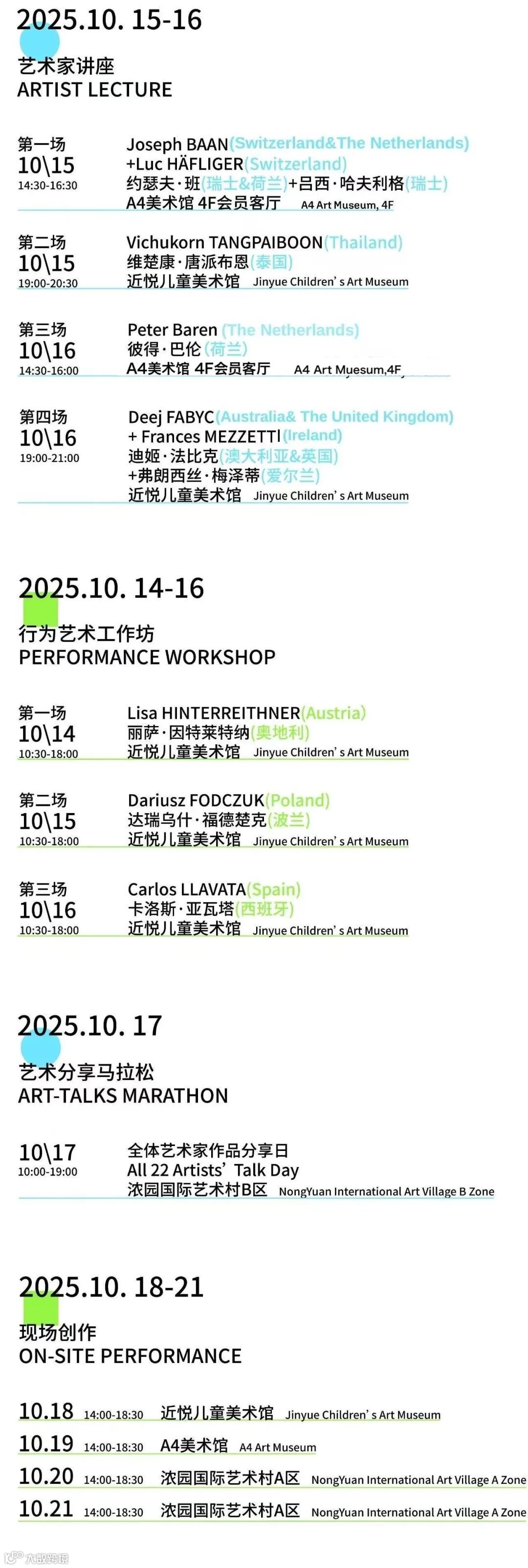近悦儿童美术馆、A4美术馆、浓园文化、上城设计事务所、东来艺术、优活文化、朱朱、戴敏、翟一涛、王彦鑫、唐勇(迈克生物)、彭湘、100公里&空间、水鬼,邓乐,蔡斯民、冯晓炜、董柯君