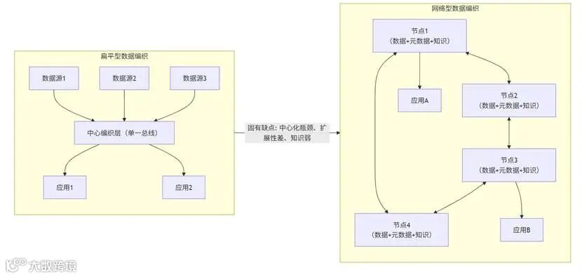 网络型:节点间可自治协作,形成数据网状结构 → 灵活、可扩展、支持语义与知识