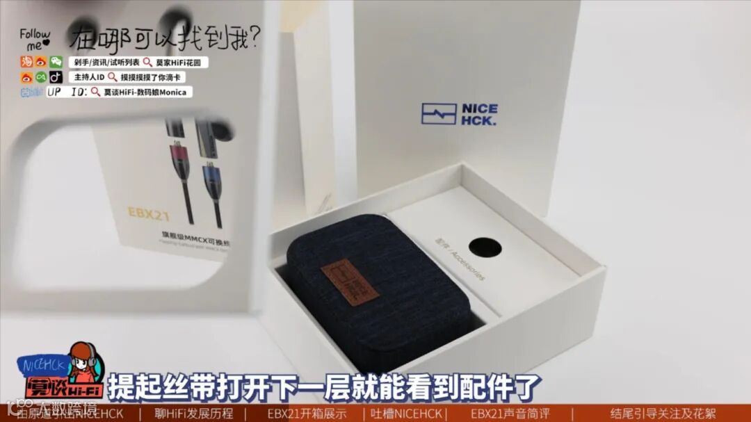 NICEHCK EBX21的包装非常精致简约,纯白色调,封套和内盒是嵌套结构,稍稍外拉便可抽出。封套正面印有NICEHCK EBX21的证件照,上方Logo下方型号和双语产品名称;