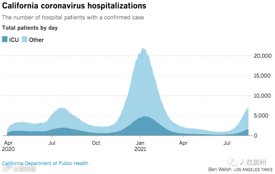 新冠住院人数的增长也在放缓。加州周日报告称,医院里有7,166名新冠患者,比前一周增加了20%。但这与7月下旬相比已经有所改善,当时住院人数每周比每周增加50%,但仍远低于去年冬季的峰值22,000人。