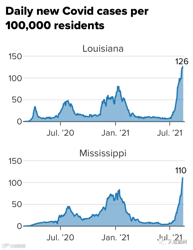 激增的delta变种对墨西哥湾沿岸造成了特别严重的打击,迫使医院达到了极限。为了控制路易斯安那州的疫情,官员们在7月份建议每个人都要在室内戴口罩,无论他们是否接种了疫苗。8月2日,在口罩明显不起作用、病例不断攀升后,他们重新实施了一项全州范围内的口罩强制令。