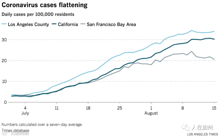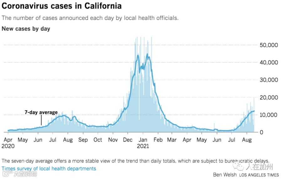 根据《洛杉矶时报》的分析,加州在过去一周每天报告约11,800例新冠病例,比前一周增加7%。这一增长速度远低于前一周的30%,也远好于7月初的86%。每日新增病例仍远低于疫情高峰时期的每日近4.5万例。