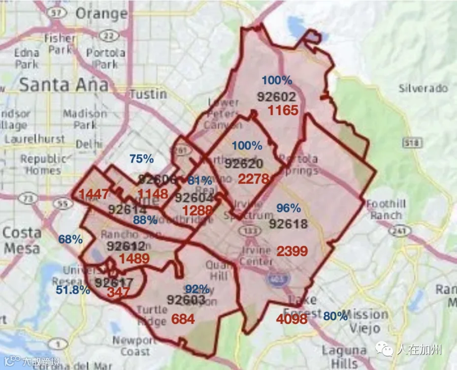 邮编:92614;人口:25,741人;确诊案例:1447;已接种疫苗人数比例:88%