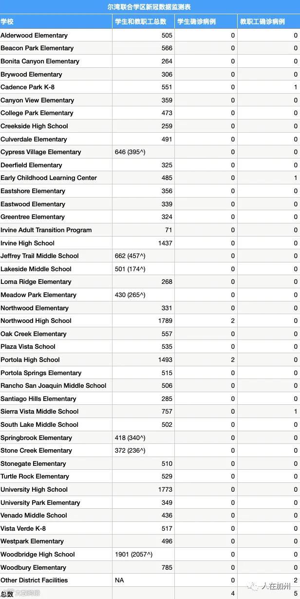 根据8月17日更新的数据,尔湾学区目前有4位学生确诊新冠,5位老师教职员工确诊新冠,共9人确诊。