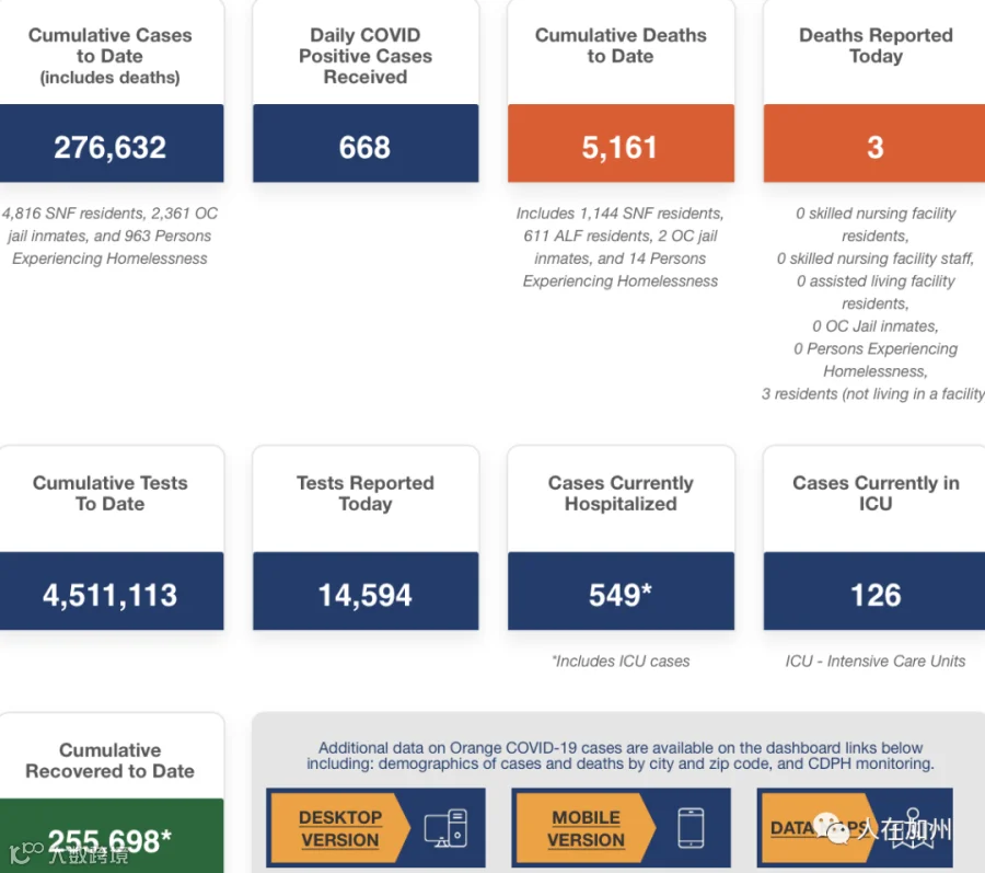 橙县新增668例,累计共276632例。目前橙县住院收治549人,重症126例,康复255698人。尔湾市目前共12333例,新增28例。