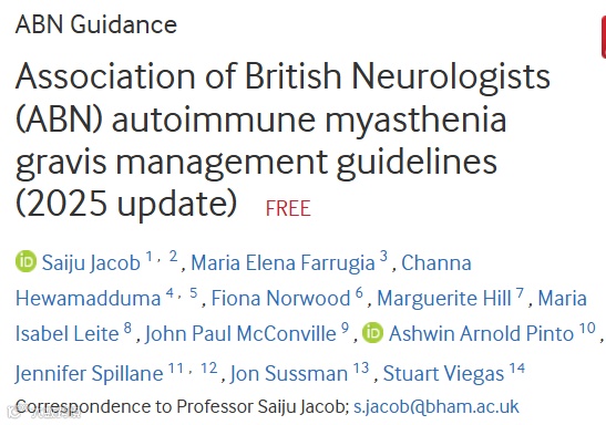 2025年更新的ABN重症肌无力管理指南强调了早期胸腺切除、早期使用利妥昔单抗以及新型靶向治疗药物在MG管理中的重要性。这些更新反映了近年来的研究进展,并为临床医生提供了更具体的治疗建议。未来的研究应进一步探索新型药物的长期疗效和安全性,以及如何更好地整合多学科团队资源以提高患者的生活质量。