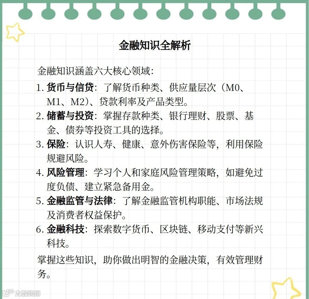 掌握这些金融知识,可以帮助个人或家庭更好地管理财务,做出明智的金融决策。
