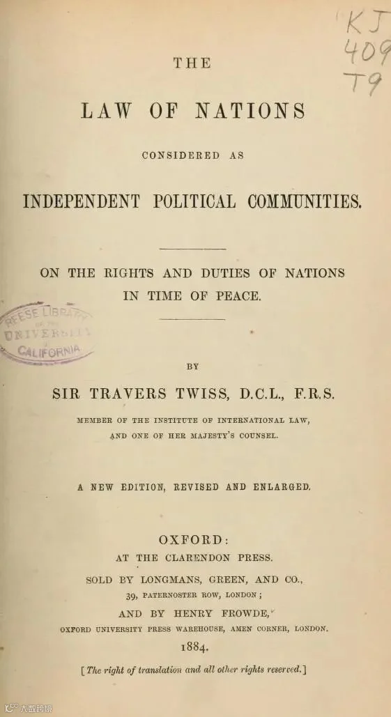 Travers Twiss著The Law of Nations Considered as Independent Political Communities