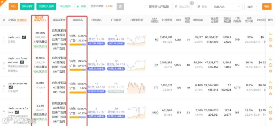 通过关键词流量占比,你可以快速分辨该ASIN的关键词流量分布,以该链接为例,前两个关键词流量占比34%+,可以得到该产品的流量重心,如果我们对其有优势,可以从它的主要流量词入手去进攻它的流量池。