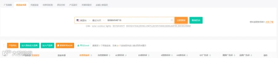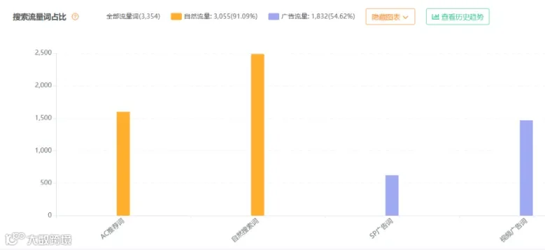 利用卖家精灵——查流量来源,可以查看到该产品获得AC标的关键词有1599个,自然搜索词在全部流量词中占比74%,SBV广告流量词1468,占全部流量词的44%。