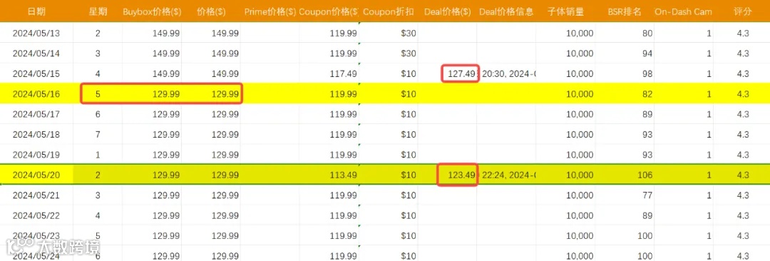 如图,根据以上特点,已知之前价格为149.99,秒杀价127.49,那么我们基本可以断定该产品在周五开始的129.99价格,为运营手动降价,而不是活动价格。