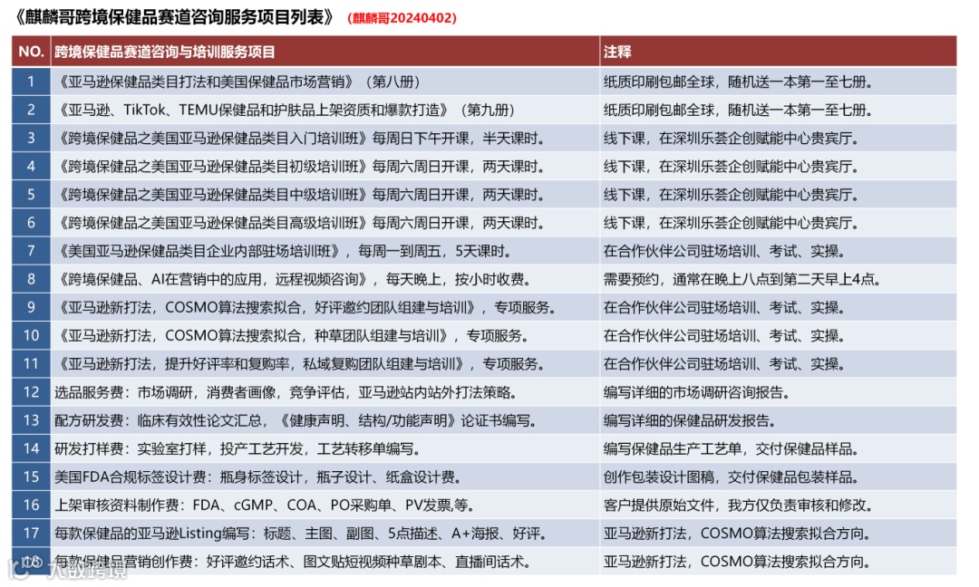 麒麟哥跨境保健品赛道咨询服务项目列表