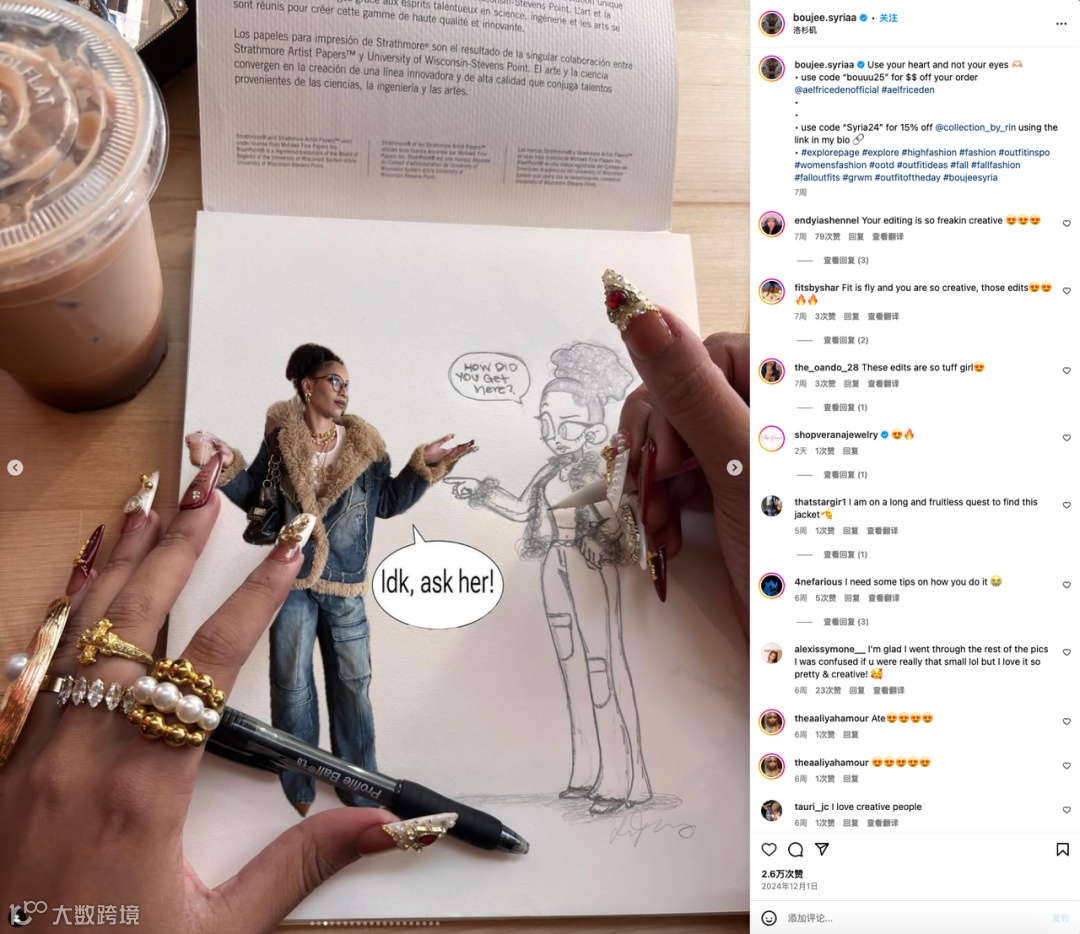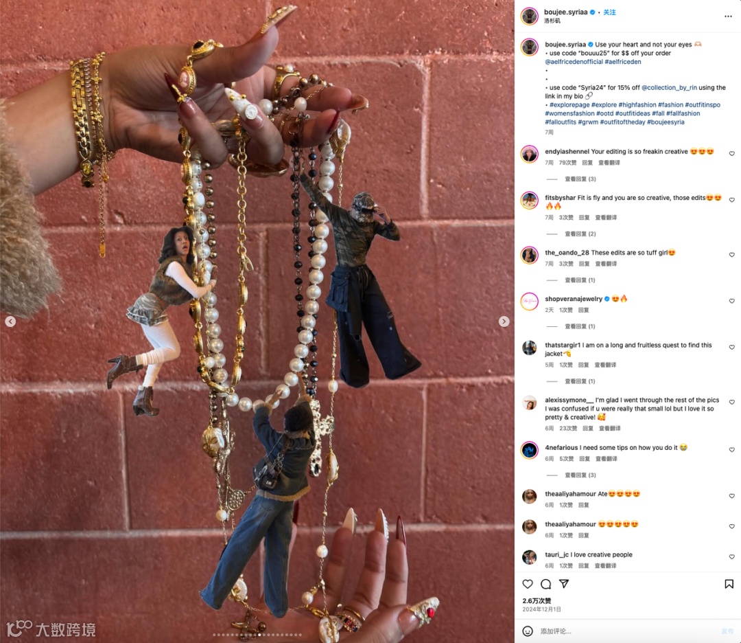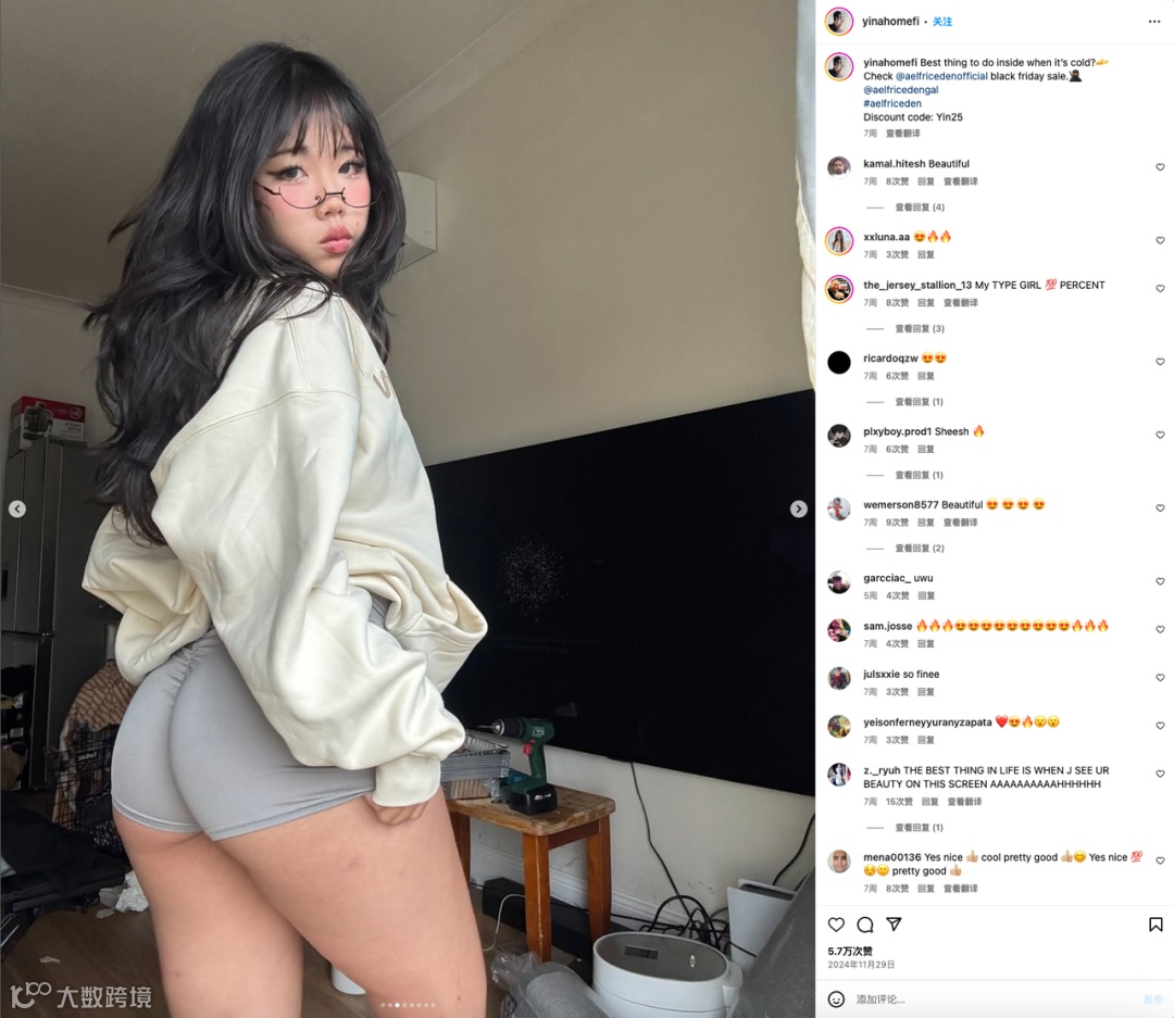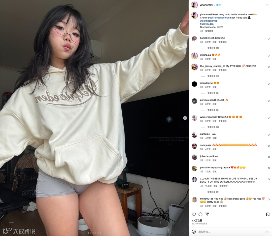 配合Yina在帖文简介处留下的品牌官号地址和Discount code,这对Aelfric Eden来说是双赢的局面,同时获得了品牌声量和销量的增长。