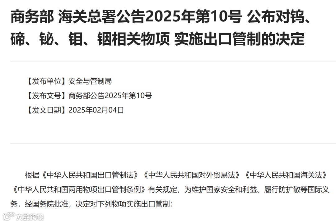 同日,商务部、海关总署:对钨、碲、铋、钼、铟相关物项实施出口管制