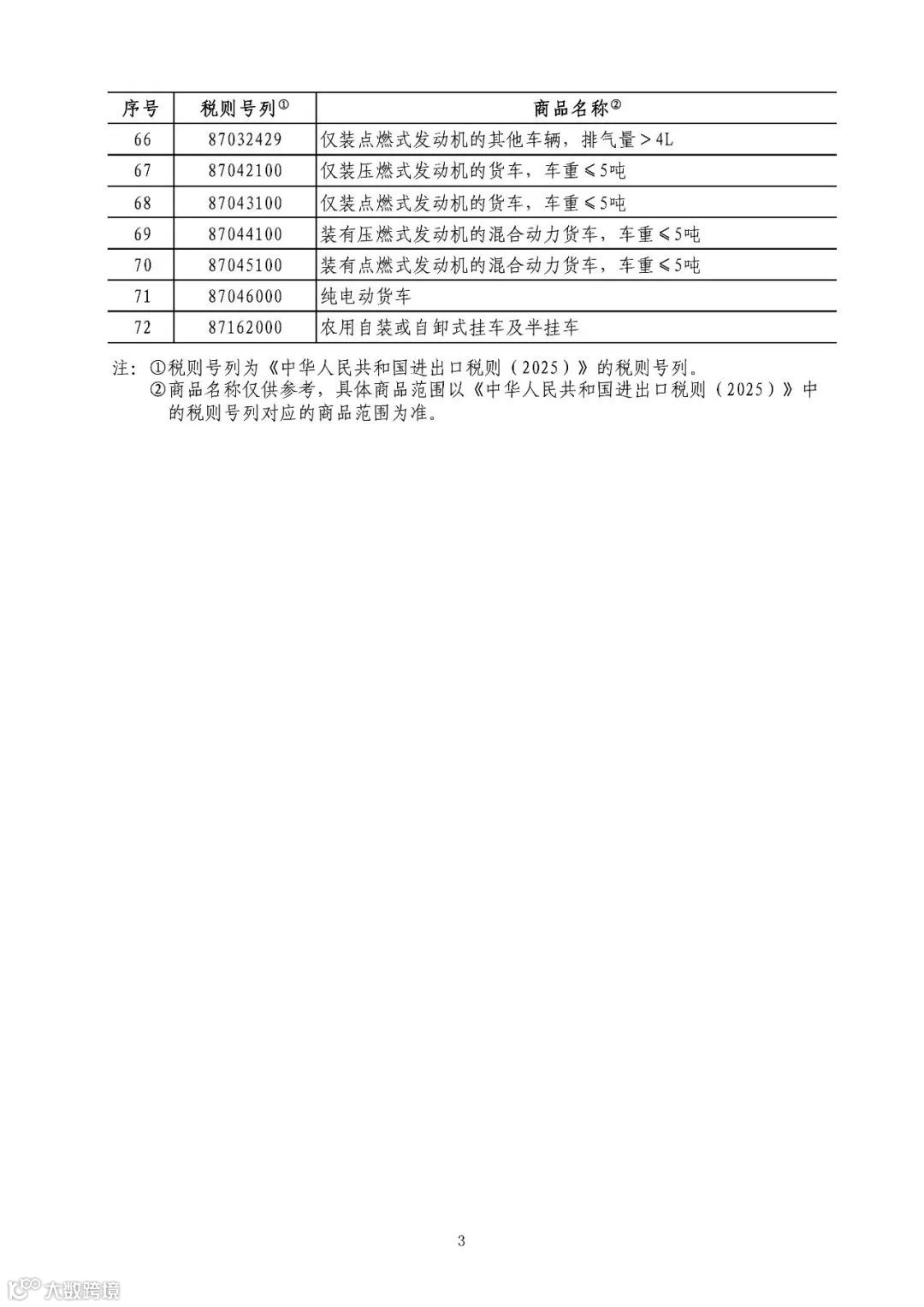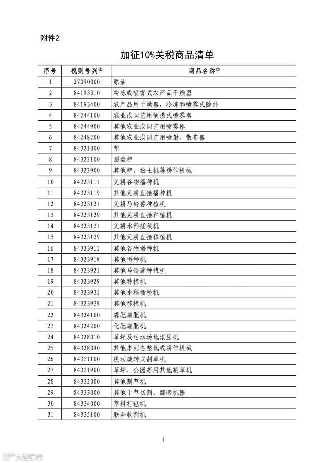二、对原油、农业机械、大排量汽车、皮卡加征10%关税,具体商品范围见附件2。