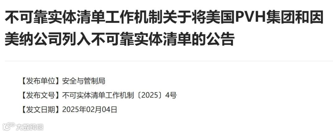 为维护国家主权、安全和发展利益,根据《中华人民共和国对外贸易法》《中华人民共和国国家安全法》《中华人民共和国反外国制裁法》等有关法律,依据《不可靠实体清单规定》有关规定,不可靠实体清单工作机制决定将美国PVH集团、因美纳公司(Illumina, Inc.)列入不可靠实体清单。