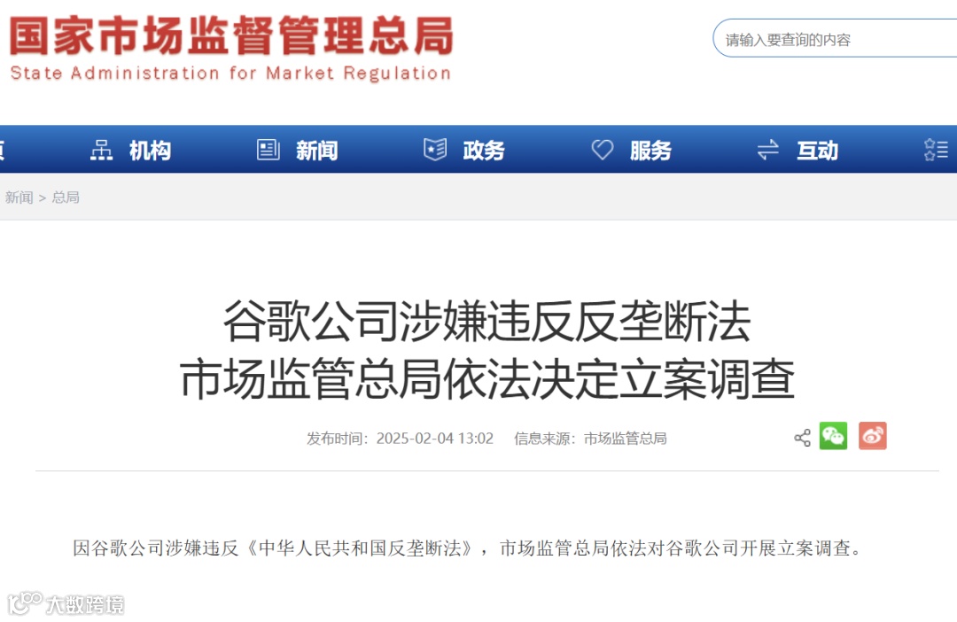 2月4日,据国家市场监管总局消息,因谷歌公司涉嫌违反《中华人民共和国反垄断法》,市场监管总局依法对谷歌公司开展立案调查。