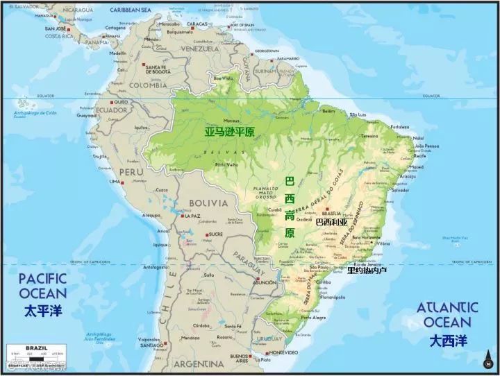 (巴西由亚马逊平原、巴西高原和东南沿海狭长平原与山地组成。)