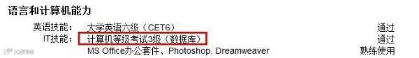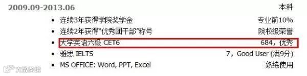 属于简历中的必备内容。现在还没有一种英语考试的规模与基本认可度超过英语四、六级考试,该证书一直是用人单位衡量应聘大学生英语水平的一个重要标准。有些单位录用人员时明确规定毕业生英语四级或六级考试合格。