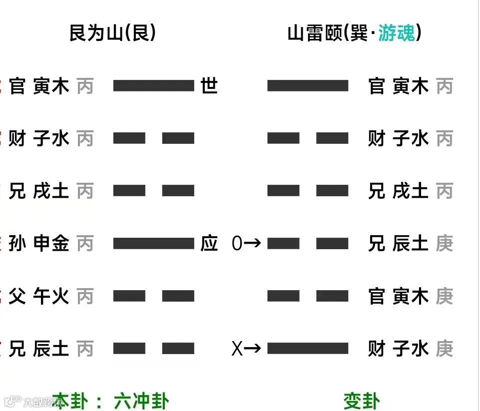 例三:寅月丙申日,占官之升迁,得艮变山雷颐。