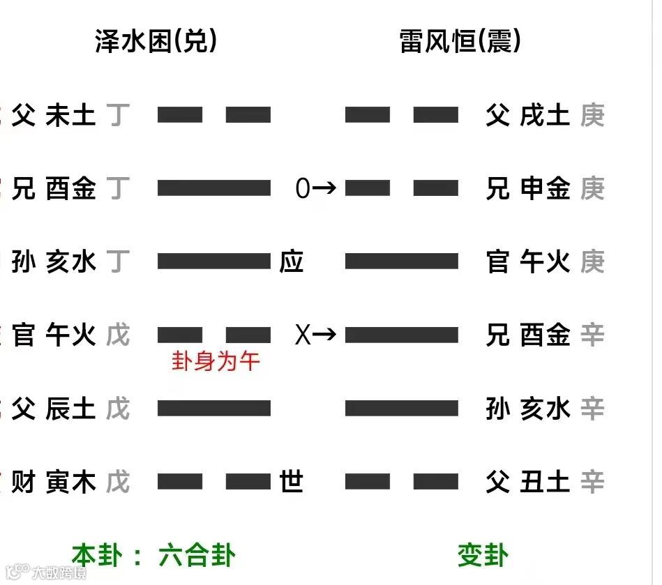 例四:午月丁未日,占弟被论,吉凶如何?得泽水困变雷风恒。