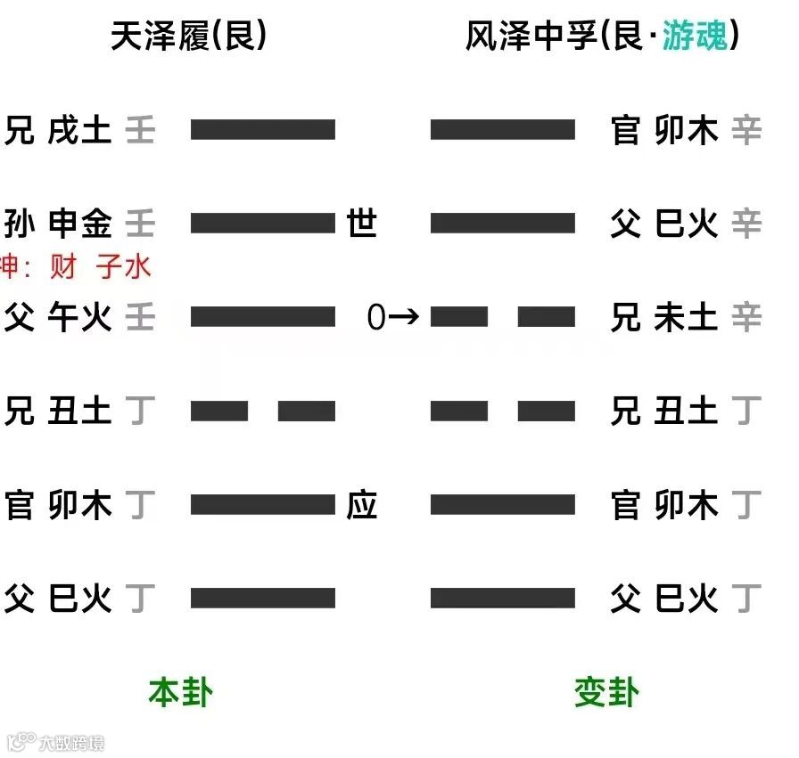 例七:未月甲午日,占子痘症,得履之中孚。