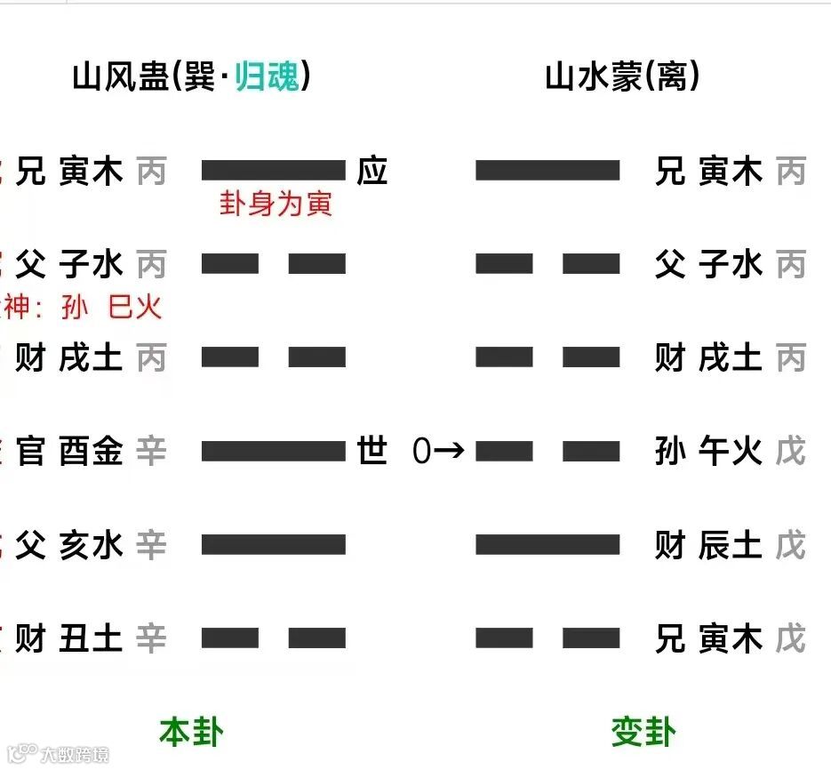 例二:酉月丙寅日,占谒贵,得山风蛊变山水蒙。