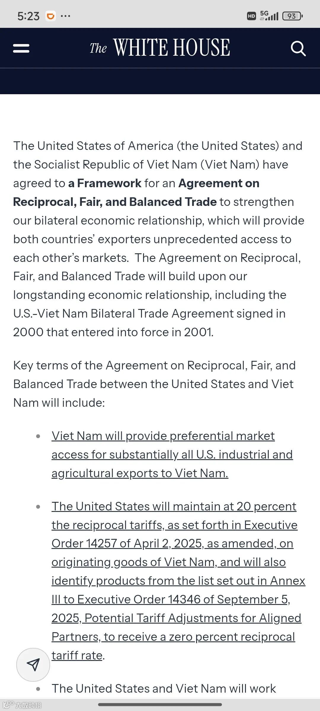 美利坚合众国(美国)与越南社会主义共和国(越南)已同意一项互惠、公平、平衡贸易协定框架,以加强我们的双边经济关系,这将为两国出口商提供前所未有的市场准入。这项《互惠、公平、平衡贸易协定》将建立在我们长期的经济关系基础之上,包括2000年签署并于2001年生效的《美越双边贸易协定》。美利坚合众国与越南之间的《互惠、公平、平衡贸易协定》的关键条款将包括: