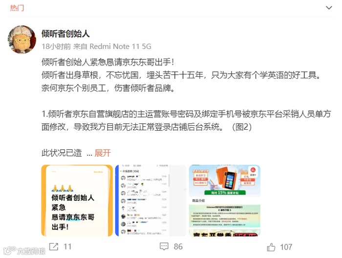 其实就在一个月前,“倾听者”品牌创始人通过社媒发声,称旗下京东自营旗舰店被平台采销人员单方面修改手机号及账号密码,导致店铺运营全面 瘫痪。不仅客服和售后申请无法及时处理,还被锁定库存,导致消费者无法正常购买,严重影响用户体验。