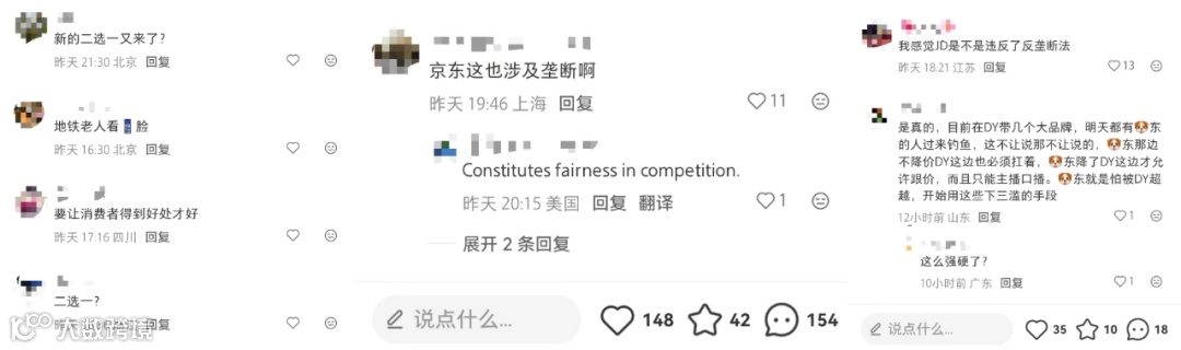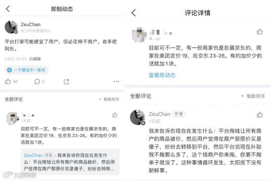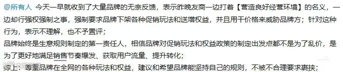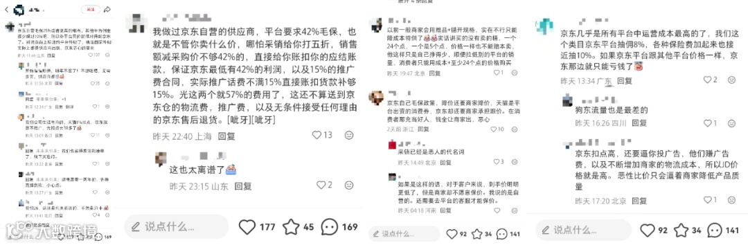 另一方面,有商家表示京东毛利保护政策导致扣点和费率一般高于其他平台,粗暴比价并不公平。其实平台定位不同,京东过去在品质和服务方面的心智溢价,用户并非不接受。贸然要求最低价,并且还是以伤害商家利益的方式,几乎可以说是自毁长城了。