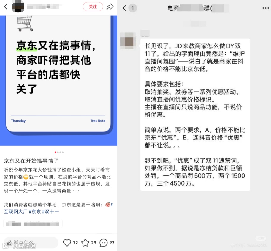 正在这场紧张冲刺的关头,不少商家却被一场突发的闹剧打乱了节奏:日前,据羊城晚报等多家媒体报道,京东被曝疑似在双11期间干涉商家在其他平台的自主经营,限制商家在抖音等平台直播间的促销形式,包括不得在直播中抽奖、不允许发放优惠券、不能提及价格优惠等。