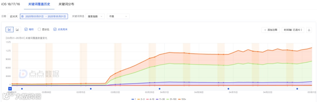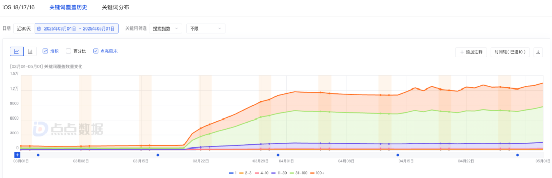 案例:某金融产品上线初期,因仅配置基础关键词且存在大量无效词,导致流量入口不足1000。通过筛选行业高价值关键词,并借助点点数据的ASO优化业务提升关键词覆盖效果,一个月内流量入口突破12,000+,实现120%的显著增长。