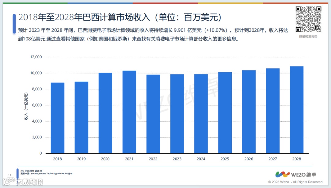 无论在什么国家,电脑都是上班族的刚需产品,巴西也不例外。预计2023年到2028年间,巴西计算机市场(包括笔记本、平板、台式)收入将持续增长10亿美元左右,这是一个良性增长的信号,意味着现在出海为时不晚。