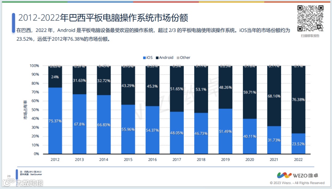 巴西的三星的平板电脑拥有量位居榜首,苹果紧随其后,其他品牌电脑星罗分布。如果是和平板电脑有关的消费电子配件或成品,可以考虑在出海时侧重于安卓系统的产品。