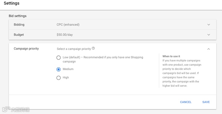 Google购物的优先竞价机制是怎么构建的?为了理解这一机制,首先要明白,在创建时,存在一个优先级设定功能。在默认的情况下,所有广告系列的优先级都被设为‘低’,但你可以将它调整为‘中’或‘高’。