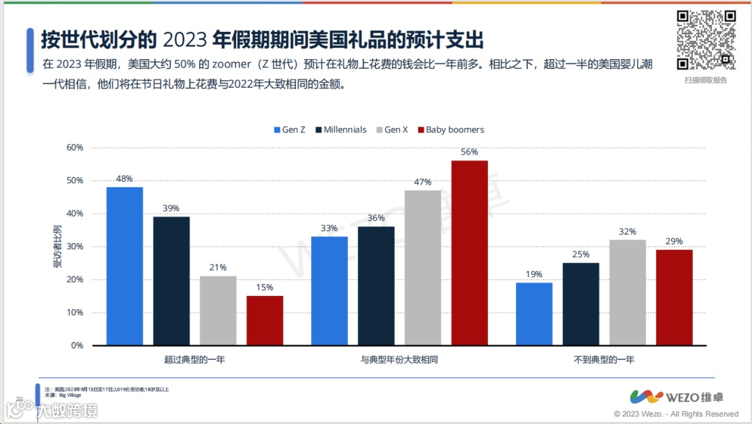 01假日销售额将达到约9573亿美元,较上年增长约3%-4% 2023年,美国假日零售额预计达到约9573亿美元,虽然一定程度受到通货膨胀的影响,但总体的零售额还会出现上涨,增长率为3%左右。在9月份的一次消费者调查中显示,美国约有58%的消费者打算在圣诞商品上花费与上一年大致相同的金额。 美国作为经济体大国,其消费实力排名靠前,这也吸引了国内一大批企业出海美国,挖掘美国消费者的购物需求及偏好。而圣诞节作为美国人最受欢迎的top3节日,这一时期的品类选择也多到让人眼花缭乱,物价也在一定程度内持续飙升;对于出海企业而言,如何瞄准美国消费者的假日需求,进而投其所好便成为了首要解决的问题。 02 88%的消费者将开启圣诞购物,哪个品类最受欢迎? 根据调研,88%的消费者表示他们将在2023年庆祝圣诞节。那么,不同世代的消费者对于圣诞节支出的态度如何?其中有一个趋势跟我们的预测一致——那就是Z世代群体。48%的Z世代人群表示,今年购物支出会比2022年更多。果然非常符合他们“享受当下、及时行乐”的年轻化标签。针对这部分人群的购买喜好,你准备好了吗? 而对于出海企业而言,还有一个较为关心的话题就是哪些圣诞品类会爆单。这份报告中,我们也调查了美国消费者关于今年的购物计划,不论是给别人还是给自己的圣诞礼品,衣服鞋子都位居榜首,礼品卡和电子产品分别位列第二、第三。同时,本榜单共列出了排名前10及最低的礼物名单,想要了解更多?赶紧下载报告来看看吧! 03 34%的消费者将使用社媒购物,60%总预算用于网购 近年来,社交媒体在美国的假日购物中发挥着越来越重要的作用。调查显示,在2023年,大约34%的购物者计划使用这些平台搜索或购买假日产品。而由于通货膨胀的影响,价格成为了美国消费者最为关注的因素。 值得注意的是,在今年的调查中,超过50%的美国受访者表示,他们会比平时更期待圣诞节大促,消费者计划将假日季总预算的60%以上花在网购,其余用于实体店。相应地,我们在做圣诞营销或投放广告时,也需要考虑消费者的购物习惯及媒体的偏好,科学合理地布局自己的媒体组合策略,这样才能持续地在圣诞节中冲顶销量。 04这对出海广告意味着什么? 圣诞节是西方最为隆重也最受欢迎的节日之一。一般而言,美国消费者将会在12月底前结束购物。不论是在选品、定价、促销还是广告中圣诞元素的体现,我们都应该细致地分析美国目标人群,以及他们的购物偏好趋势(如越来越多的人群选择使用社交媒体搜索和购买产品),报告中还有更详细的人群分析、圣诞节花费分析等内容,如果您对报告感兴趣的话,欢迎免费下载完整版内容查看!