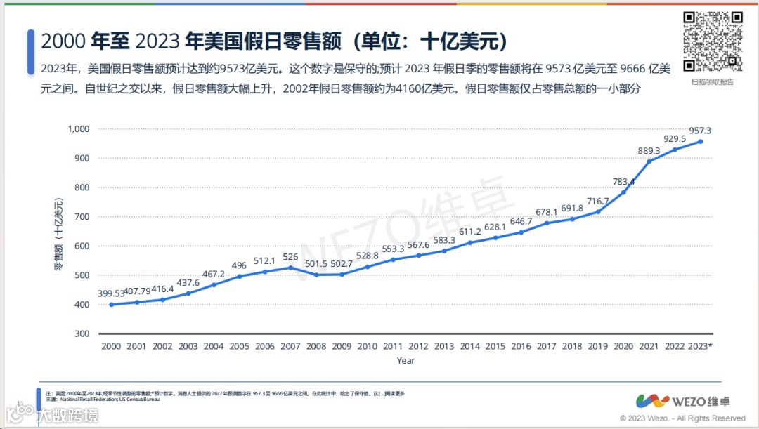 圣诞节是美国家庭最重要的节日之一 在圣诞节期间 美国家庭会进行一系列的庆祝活动 按照惯例,他们会提早2个月左右来筹备节日 为家人朋友准备节日礼物、或是享受假期购物 2023年,由于受到通货膨胀的影响 美国消费者今年的购物花费与往年相比如何? 哪一部分的人群消费增了或减了? 哪些因素影响着他们的购买决策? 他们的购物习惯改变了吗?会在哪些平台搜索和购物? 带着这些问题 我们马上来看看这份美国消费者洞察报告 话不多说,马上开始吧! 文章篇幅有限,想要了解更多内容,请免费下载43页的《2023美国圣诞节购物洞察》,获取更详细的数据信息! 01假日销售额将达到约9573亿美元,较上年增长约3%-4% 2023年,美国假日零售额预计达到约9573亿美元,虽然一定程度受到通货膨胀的影响,但总体的零售额还会出现上涨,增长率为3%左右。在9月份的一次消费者调查中显示,美国约有58%的消费者打算在圣诞商品上花费与上一年大致相同的金额。 美国作为经济体大国,其消费实力排名靠前,这也吸引了国内一大批企业出海美国,挖掘美国消费者的购物需求及偏好。而圣诞节作为美国人最受欢迎的top3节日,这一时期的品类选择也多到让人眼花缭乱,物价也在一定程度内持续飙升;对于出海企业而言,如何瞄准美国消费者的假日需求,进而投其所好便成为了首要解决的问题。 02 88%的消费者将开启圣诞购物,哪个品类最受欢迎? 根据调研,88%的消费者表示他们将在2023年庆祝圣诞节。那么,不同世代的消费者对于圣诞节支出的态度如何?其中有一个趋势跟我们的预测一致——那就是Z世代群体。48%的Z世代人群表示,今年购物支出会比2022年更多。果然非常符合他们“享受当下、及时行乐”的年轻化标签。针对这部分人群的购买喜好,你准备好了吗? 而对于出海企业而言,还有一个较为关心的话题就是哪些圣诞品类会爆单。这份报告中,我们也调查了美国消费者关于今年的购物计划,不论是给别人还是给自己的圣诞礼品,衣服鞋子都位居榜首,礼品卡和电子产品分别位列第二、第三。同时,本榜单共列出了排名前10及最低的礼物名单,想要了解更多?赶紧下载报告来看看吧! 03 34%的消费者将使用社媒购物,60%总预算用于网购 近年来,社交媒体在美国的假日购物中发挥着越来越重要的作用。调查显示,在2023年,大约34%的购物者计划使用这些平台搜索或购买假日产品。而由于通货膨胀的影响,价格成为了美国消费者最为关注的因素。 值得注意的是,在今年的调查中,超过50%的美国受访者表示,他们会比平时更期待圣诞节大促,消费者计划将假日季总预算的60%以上花在网购,其余用于实体店。相应地,我们在做圣诞营销或投放广告时,也需要考虑消费者的购物习惯及媒体的偏好,科学合理地布局自己的媒体组合策略,这样才能持续地在圣诞节中冲顶销量。 04这对出海广告意味着什么? 圣诞节是西方最为隆重也最受欢迎的节日之一。一般而言,美国消费者将会在12月底前结束购物。不论是在选品、定价、促销还是广告中圣诞元素的体现,我们都应该细致地分析美国目标人群,以及他们的购物偏好趋势(如越来越多的人群选择使用社交媒体搜索和购买产品),报告中还有更详细的人群分析、圣诞节花费分析等内容,如果您对报告感兴趣的话,欢迎免费下载完整版内容查看!