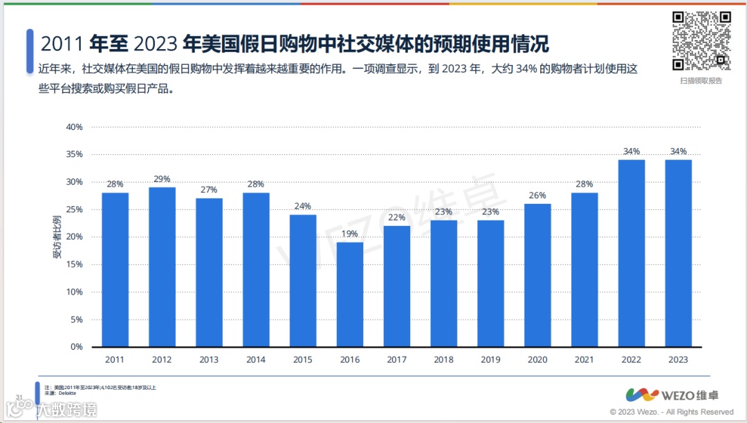 圣诞节是西方最为隆重也最受欢迎的节日之一。一般而言,美国消费者将会在12月底前结束购物。不论是在选品、定价、促销还是广告中圣诞元素的体现,我们都应该细致地分析美国目标人群,以及他们的购物偏好趋势(如越来越多的人群选择使用社交媒体搜索和购买产品),报告中还有更详细的人群分析、圣诞节花费分析等内容,如果您对报告感兴趣的话,欢迎免费下载完整版内容查看!