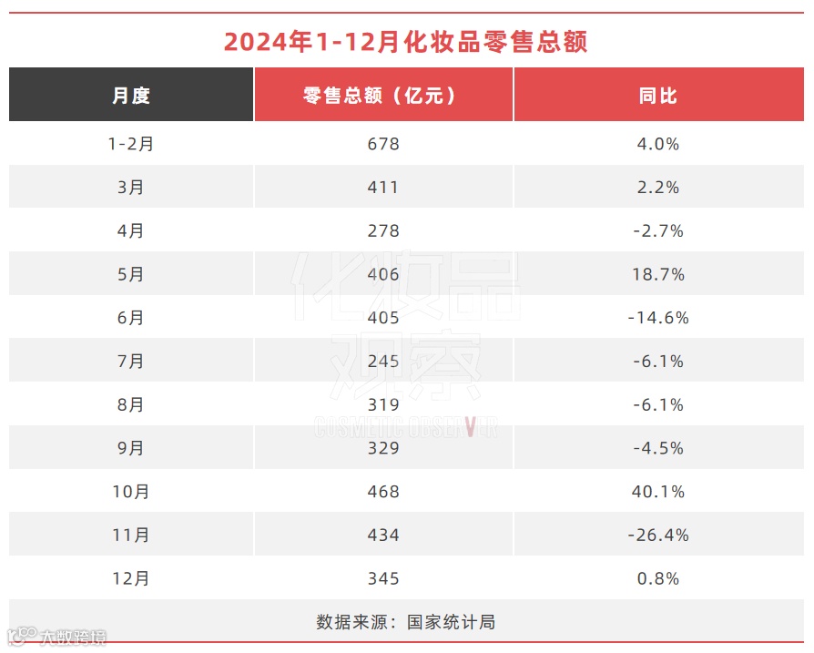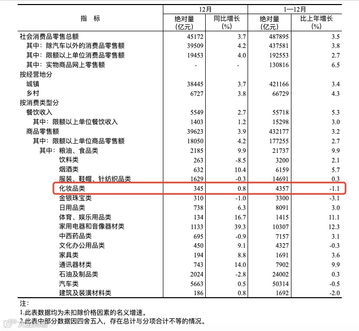 1月17日,国家统计局公布2024年12月社会消费品零售数据,其中,12月限额以上化妆品类零售额345亿元,同比微增0.8%。