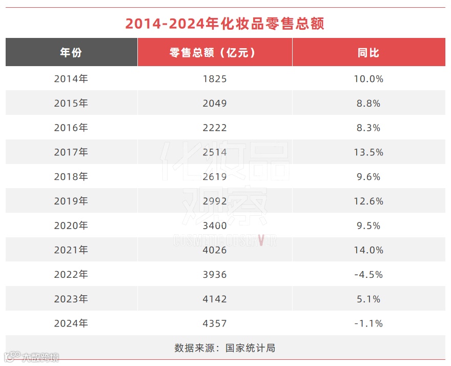 经历2023年的小幅回暖、同比增长5.1%后,2024年化妆品行业迎来第二次下跌。不过,从绝对值来看,2024年化妆品零售额创下十年来最高值,录得4357亿元,超出此前所有年份。