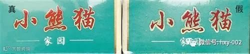 正面文字差异对比:真烟“小熊猫”字样字体较粗,字形浑厚有力,凸起明显,烫金紧凑均匀;假烟“小熊猫”字样字体较细,似连似断,凸起不明显,边缘烫金较宽。