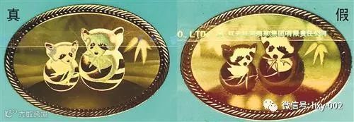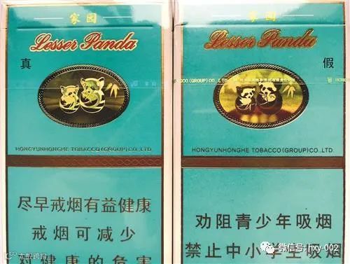 镭射防伪标识差异对比:真烟镭射防伪标识清晰、无漏色,竹叶叶片清晰光滑无条纹,两只小熊猫身上和头顶的毛粗细均匀;假烟镭射标识粗糙模糊,竹叶叶片有条纹状,两只小熊猫有漏色,身上和头顶的毛粗糙不均匀。