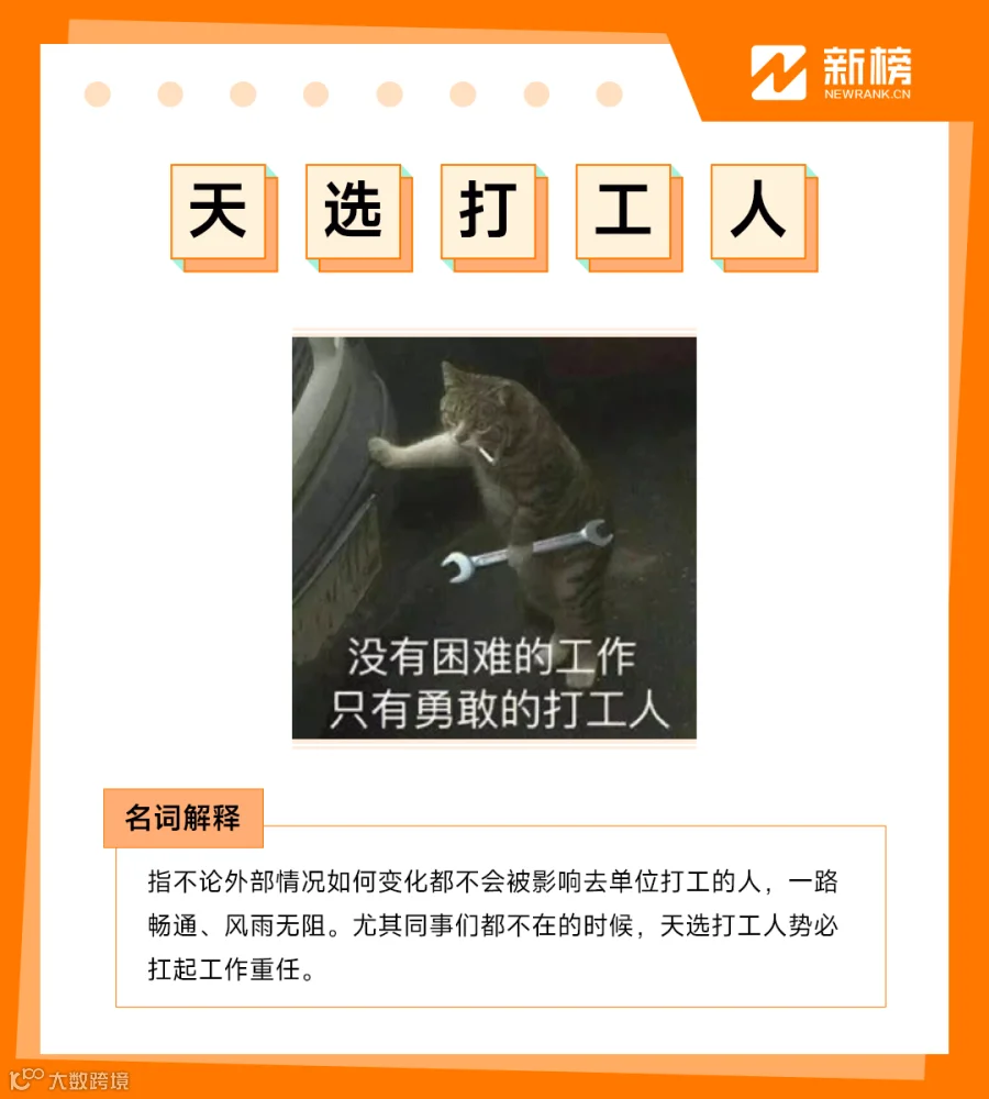 作为“天选打工人”,人们以自嘲方式表达职场坚守,这一称呼贯穿全年,反映社会情绪[k]。