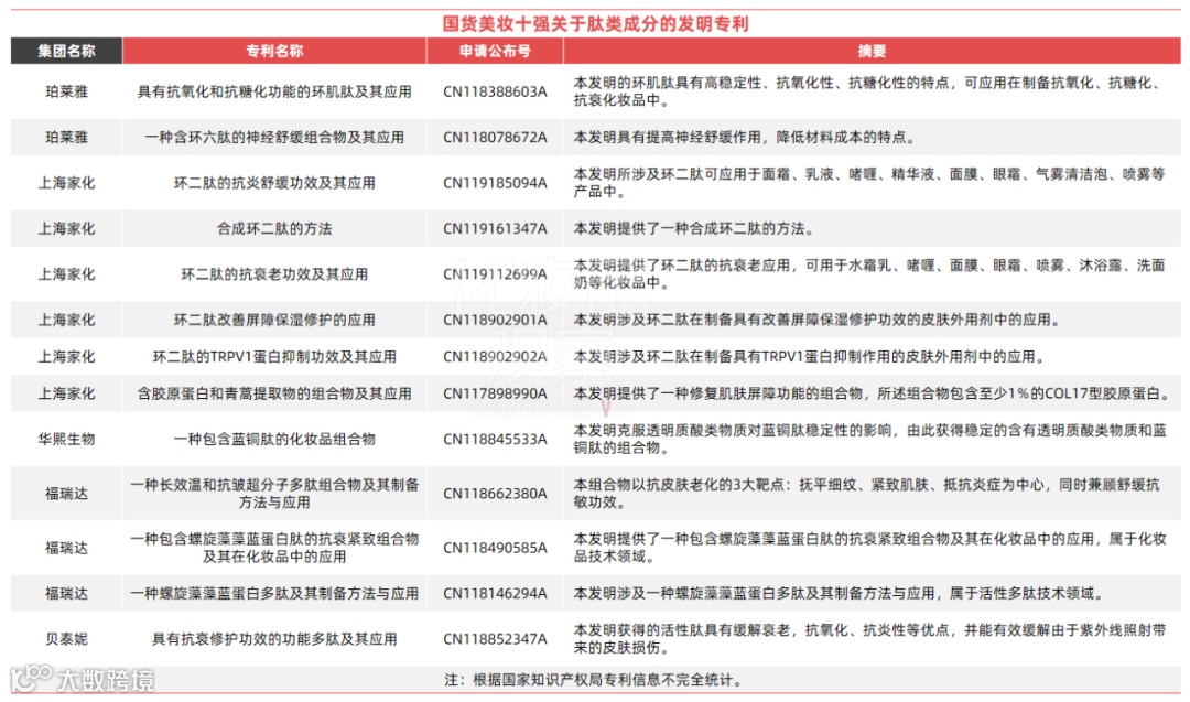 过去一年,国货化妆品十强企业中有近一半的企业都申请了肽类相关发明专利。如,福瑞达申请了3项活性多肽技术领域的发明专利,华熙生物则发明了一项“一种包含蓝铜肽的化妆品组合物(CN118845533A)”的发明专利。
